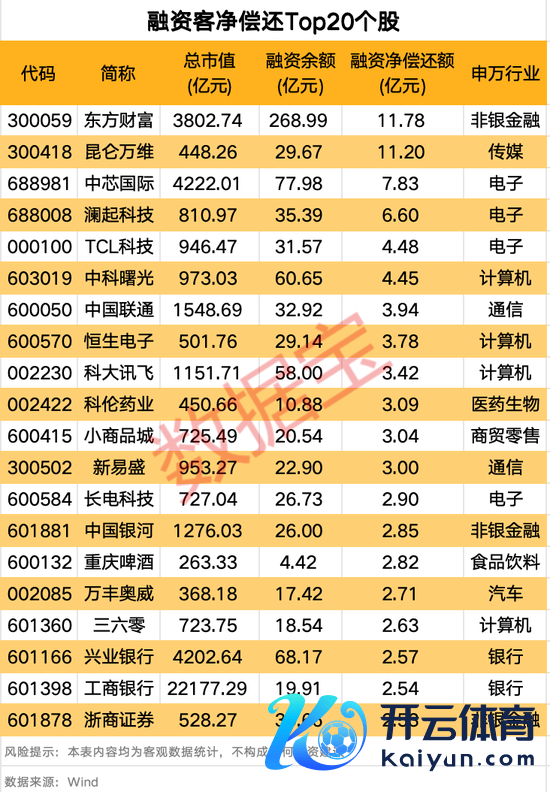 融资净偿还方面,东方钞票、昆仑万维(维权)、中芯国际、澜起科技排行前四,净偿还额顺序为11.78亿元、11.2亿元、7.83亿元、6.6亿元。行业上,软件开发股科大讯飞、三六零、恒生电子和非银金融推动方钞票、中国星河、浙商证券均登上榜单。